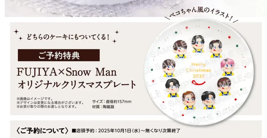 2025年の不二家×SnowManクリスマスケーキの特典は、ご予約限定・数量限定で、 ブランドキャラクターである Snow Man のイラスト入りクリスマスプレー トが付いてきます。