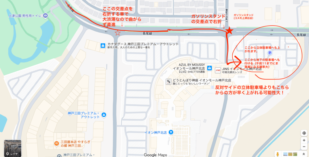 • アクセスルート:神戸三田ICからは、アウトレット駐車場への右折渋滞を避け、左手のガソリンスタンドを右折してイオンモールへ向かうルートが最適解です。