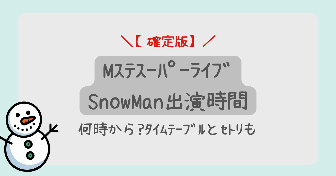 Snow Manの出演は、番組のハイライトである20時台〜21時台前半が最も有力ですが、見逃さないために19時台からの視聴をおすすめします。