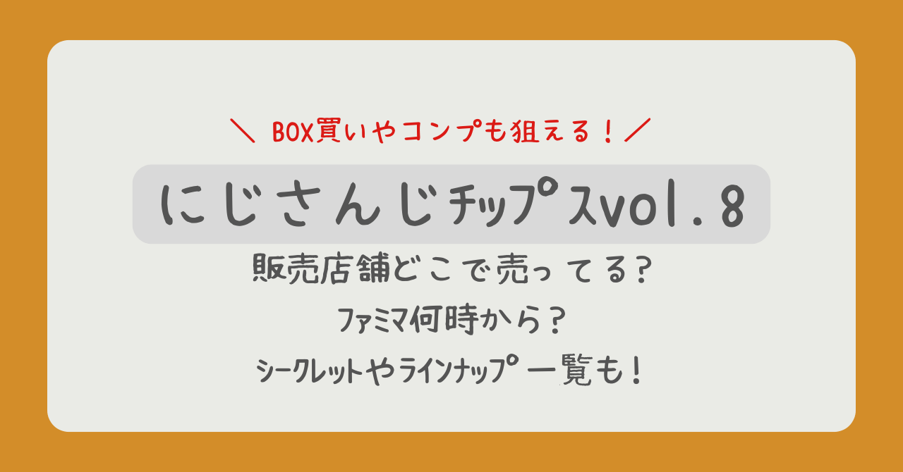 この記事では、にじさんじチップスvol.8を確実に手に入れるための販売店舗の詳細、ファミマでの販売開始時間、気になるシークレットや参加ライバー一覧について詳しく解説します。