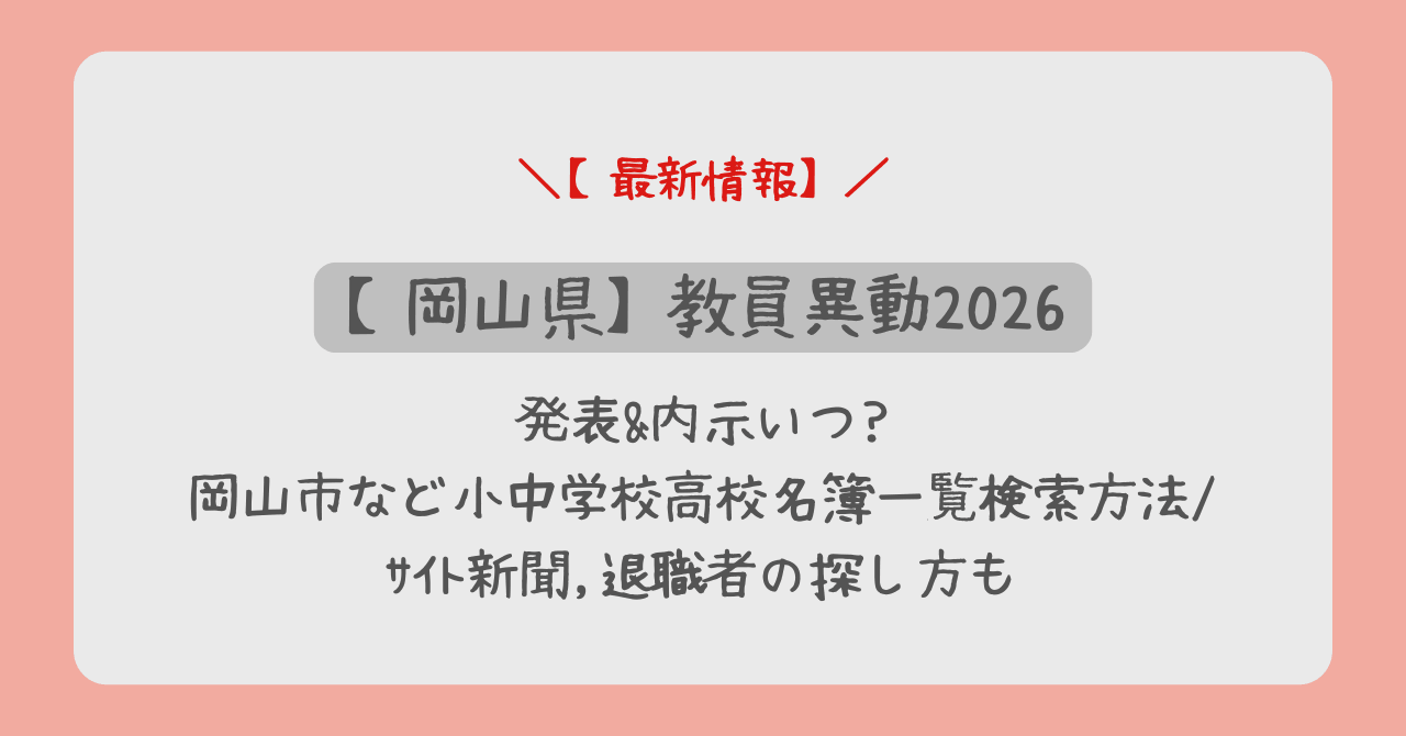 この記事では、2026年(令和8年度)の岡山県・岡山市の教員異動について、最新の発表日・内示スケジュール、山陽新聞での掲載日、公式サイトでの一覧確認方法、そして退職者の探し方まで、徹底的にまとめました。
